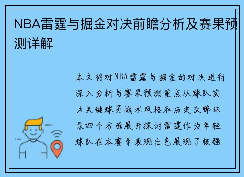 NBA雷霆与掘金对决前瞻分析及赛果预测详解